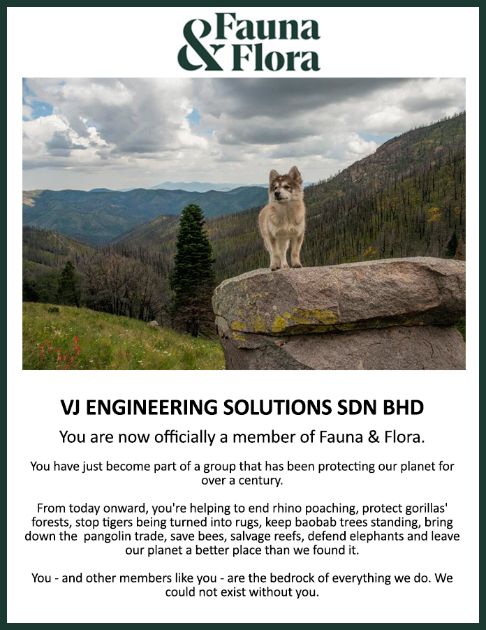 VJ Engineering Solutions Sdn Bhd’s Membership with Fauna & Flora International