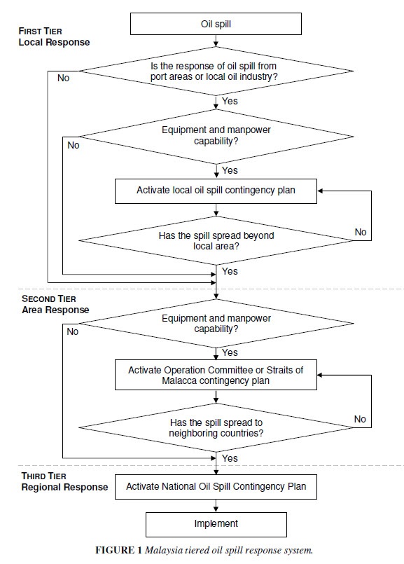 Malaysia is a maritime country, which adopted its National Oil Spill Contingency Plan (NOSCP) in early 1970. In line with established international practice, Malaysia has enacted a three-tier approach to all aspects of oil spill preparation and response, which defines the party responsible for oil spill cleanup according to different degrees of oil spill.