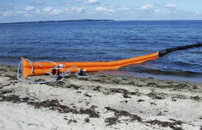 TROILBOOM BEACH is a special purpose containment boom that utilises water ballast. The water is pumped into two tubes along the bottom of the boom. This water acts as ballast when the boom is floating; once the boom is stranded these tubes sit on the ground and form a seal. The two fins running the length of the water tubes aid this effect.