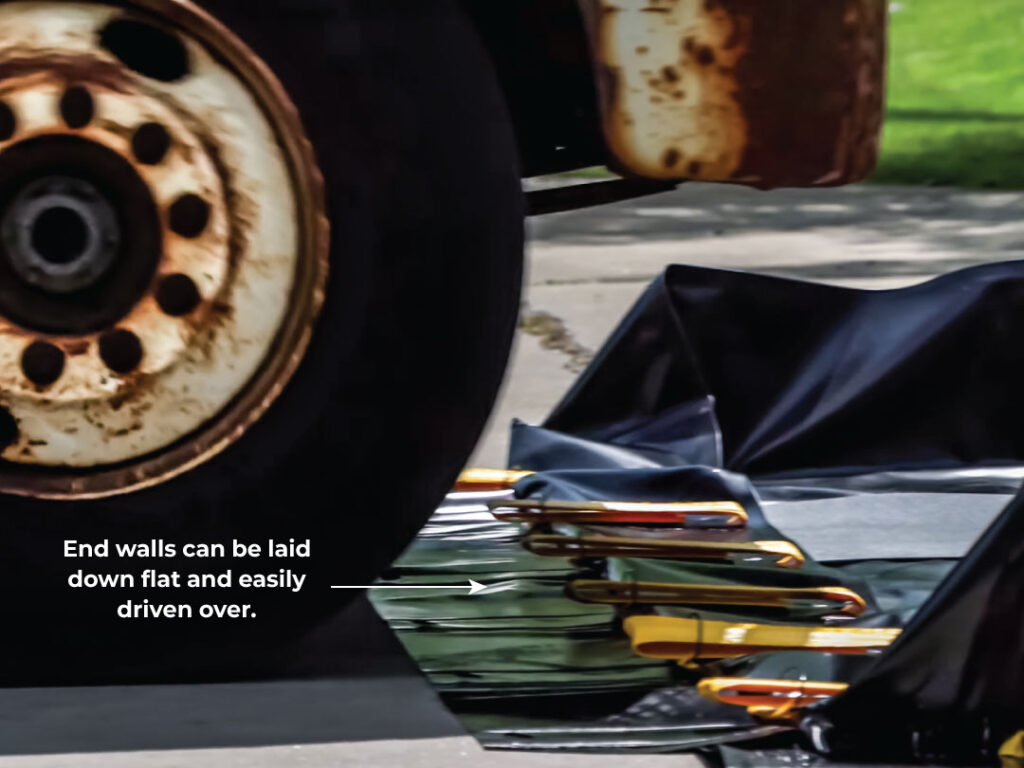 To compound the problem, most portable berms have a ‘bulkhead fitting’ on one sidewall of the berm. Unfortunately, that fitting is mounted about 2″ above the berm floor. So, even when you open the drain valve, you’re stuck with a couple of inches of water inside. It’s a sloppy breeding ground for insects in warm weather and an ice rink in the winter.