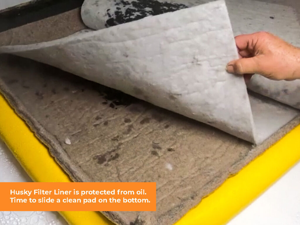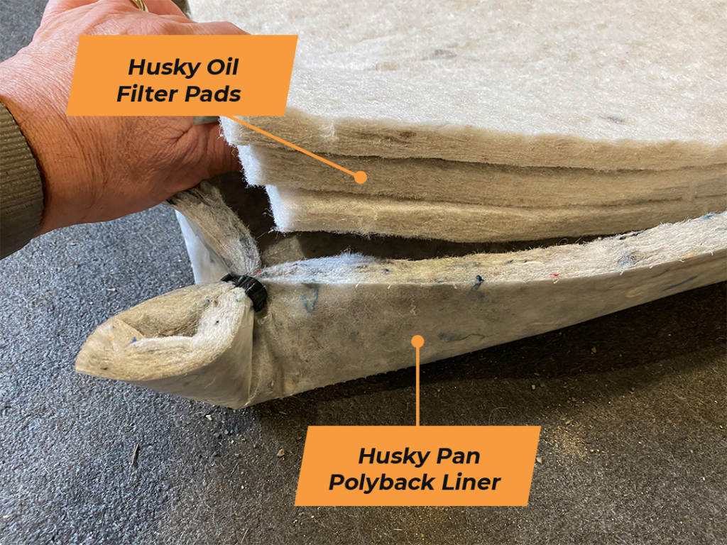 Each Super Husky Pan is made up of two replaceable parts. First, the Husky Pan Polyback Liner with impermeable backing and microfilter weep holes. Next, the Husky Oil Filter Pad inserts are tucked inside the liner.